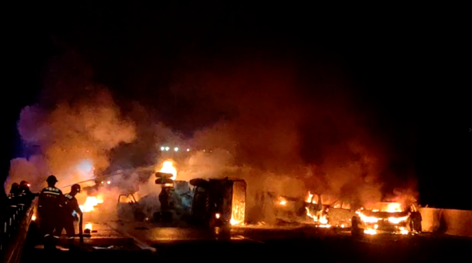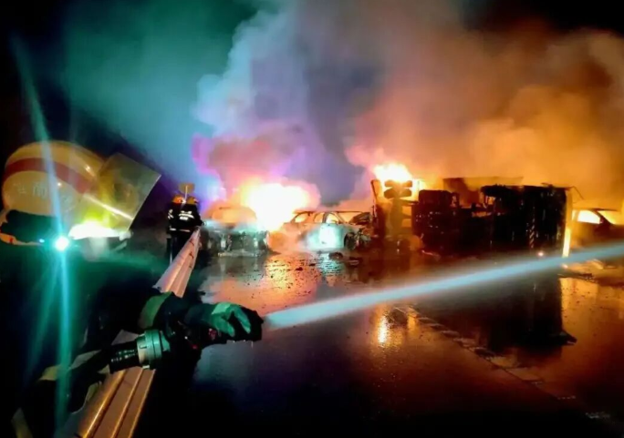 1月10日,湖南湘潭市消防救援支队接到110转警,醴娄高速发生一起惊险交通事故,一辆满载烟花爆竹的危化品运输货车发生侧翻,随即引发该路段12台车辆起火。 辖区消防救援人员接警后火速奔赴现场,经过数小时的奋力扑救,明火于1月11日1时20分被成功扑灭,待现场清理完毕,消防员收整器材归队,现场正式移交高速交警接管。 据湖南高速警察四支队1月11日发布的警情通报,这起事故的起因已初步查明,涉事车辆为轻型仓栅式货车装载的烟花爆竹在车辆侧翻后,因后方3辆小型客车避让不及相继追尾,进而引发车辆起火燃烧,飞溅的火花又顺势引燃了停在后方的8台小车,最终造成12车连环起火的局面。 事故发生后,消防、交警等多部门迅速联动处置,至1月11日3时许,该路段已恢复正常通行。此次事故共造成2人受伤,所幸均无生命危险。目前,装载烟花爆竹的,货车驾驶人及副驾驶已被公安机关控制,相关调查工作正在进一步开展中。